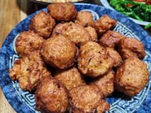 カレースプーンで掬い取ってボール状に揚げます。